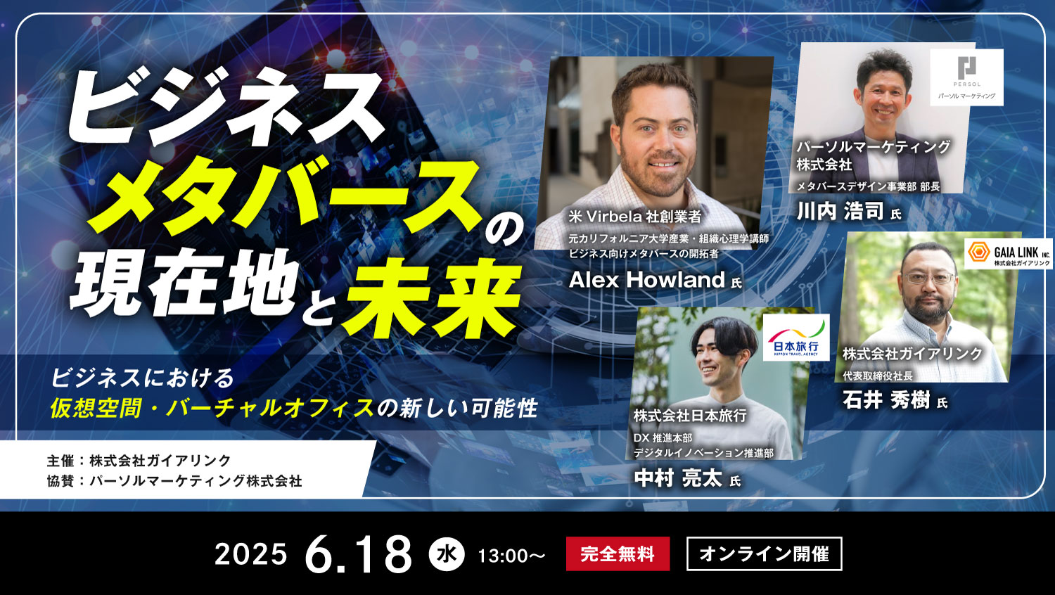 本ウェビナーでは、メタバースのBtoB活用の第一人者、バーチャルワークプレイスの先駆者であり、組織心理学の博士という経歴を持つ、米 Virbela社 創業者のAlex Howland氏を招き組織心理学をベースとした空間設計や、世界中の企業での導入事例を通じて、メタバースのBtoB活用の現実を語ります。